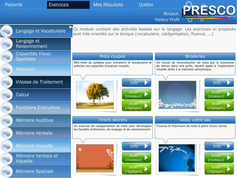 L’aspect ludique et entraînant des exercices neuropsychologiques graduels a été pensé réalisé et développé par le Pr Médalia, et par Mr Pascal Vianin tous deux neuropsychologues avec un logiciel commercialisé par Happyneuron . Le programme est dispensé au C3RP en binôme est sera disponible dès l’automne 2015 à la fois sur le site du C3RP-SHU à l’hôpital Sainte Anne mais aussi sur le centre de jour polaire du 15èmearrondissement.
